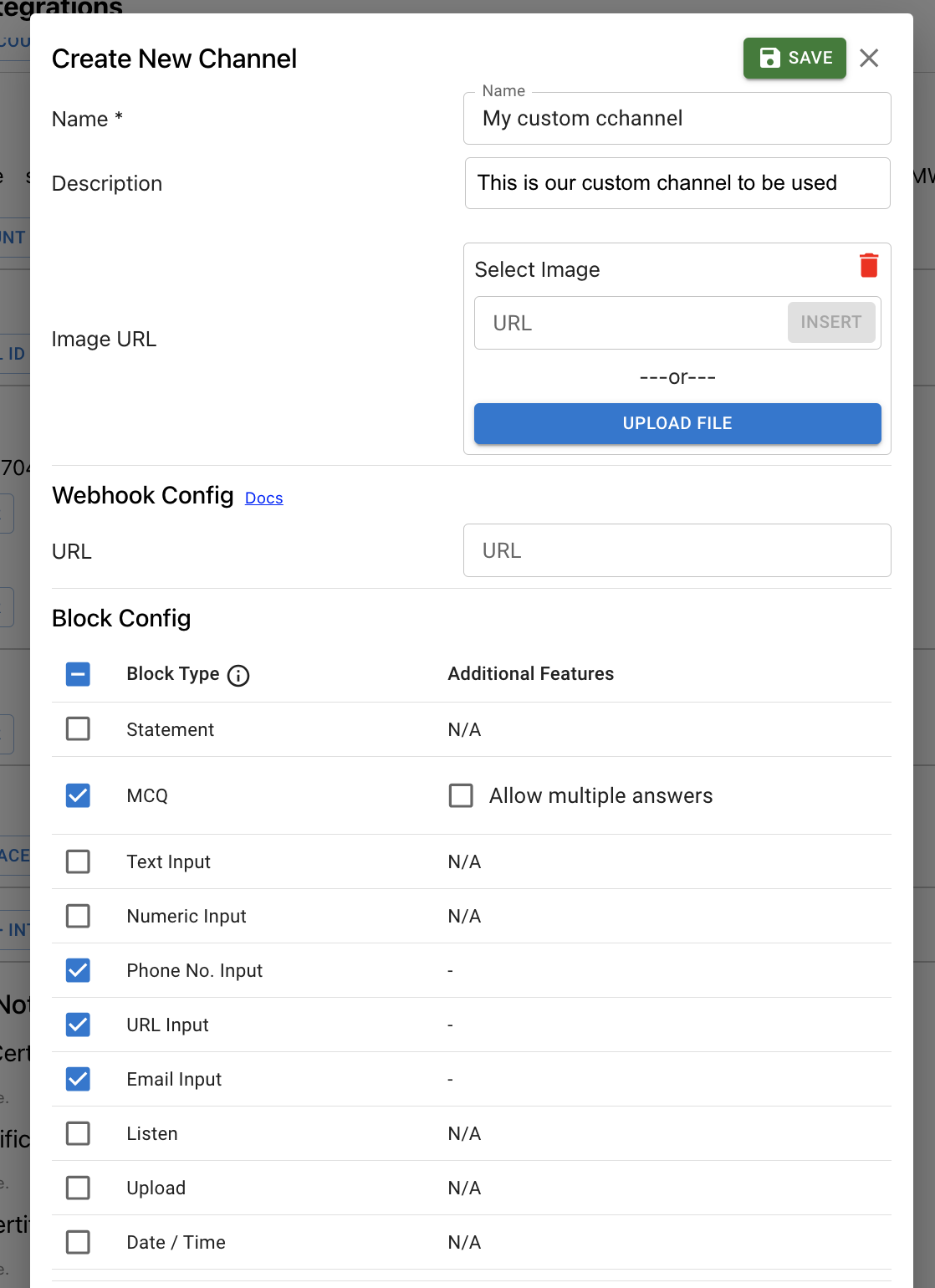 - Select all the blocks that applicable for your custom channels. You can also select any additional features that you want to enable for the block